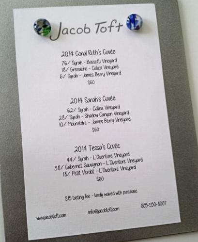 Our first stop, which was recommended by pretty much everyone we talked to about Tin City, was Jacob Toft. And our wine host was... Jacob himself! Super nice guy who has made quite a name for himself in Paso. He doesn’t own a vineyard, nor does he have any desire to. And, in my opinion, I would agree with his logic.