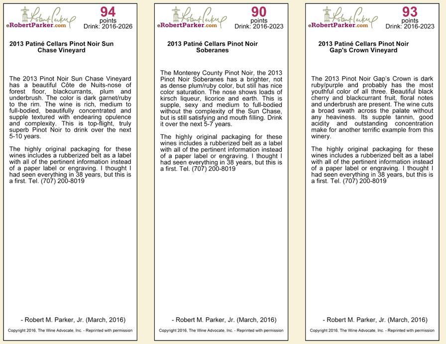 THIS JUST IN! We are thrilled to take this opportunity to share with you the results of Robert Parker's tasting of the 2013 PATINÉ portfolio as recently published in the March 2016 (#223) issue of The Wine Advocate.